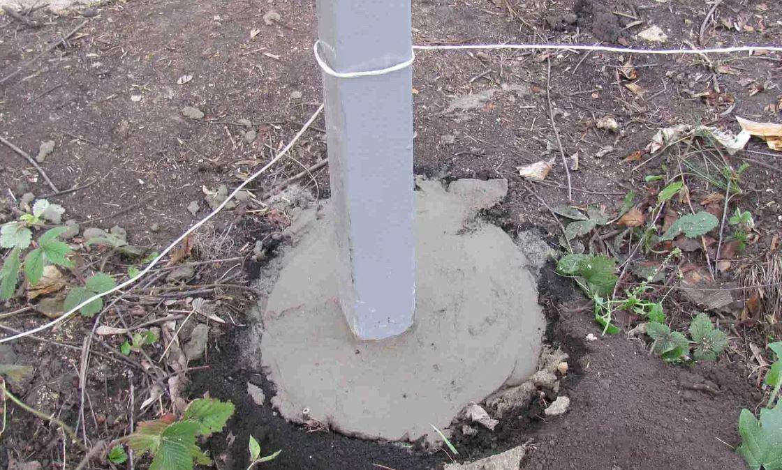 - Выкопать ямы и поставить в них столбы, убедившись в правильном направлении с помощью отвеса или строительного уровня.