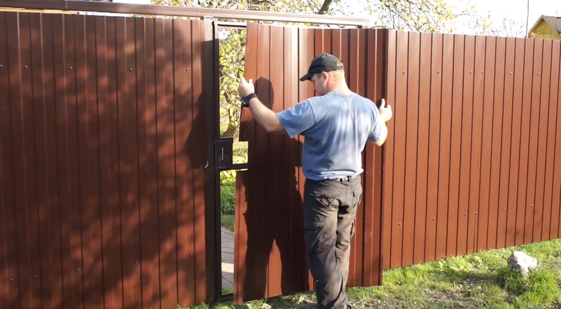 Благодаря простому устройству, распашные ворота из профнастила можно изготовить своими руками и выполнить их монтаж самостоятельно.