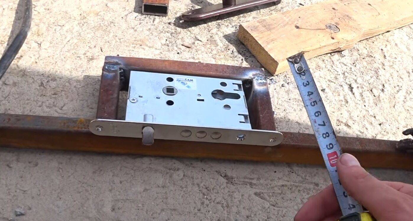 - Приварить коробку, в которую будет установлен механизм с замком (если предполагается выбрать врезной вариант). Вместо него можно использовать и обычный навесной замок – тогда к каркасу приваривают петли.
