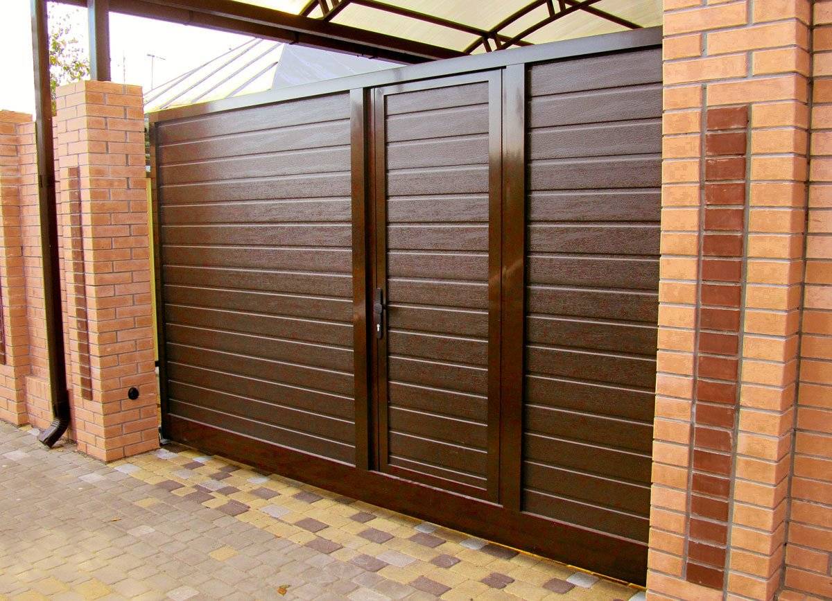 Варианты ворот из профнастила дают еще больший простор для дизайнерского творчества: откатные и распашные, с коваными элементами, со вставками из поликарбоната и древесины.