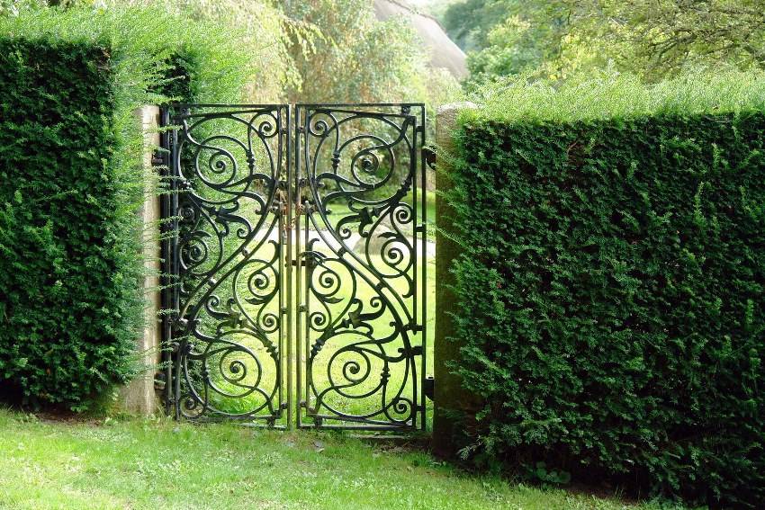 Сквозь открытый тип кованой калитки можно видеть, что находится на участке
