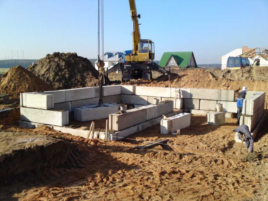 Блочный фундамент. Если вам необходим тяжёлый гараж большой площади, то лучше всего использовать блочный фундамент. Его устройство стоит дорого и требует привлечения тяжёлой техники. Но он выделяется среди других вариантов высокой надёжностью, длительным сроком службы и поистине необыкновенной несущей способностью. В качестве недостатков следует упомянуть высокую стоимость материала и работ, сложность монтажа конструкции (самостоятельно его сложить невозможно) и необходимость подготовки участка (выравнивание площади, создание котлована и т.д.).
