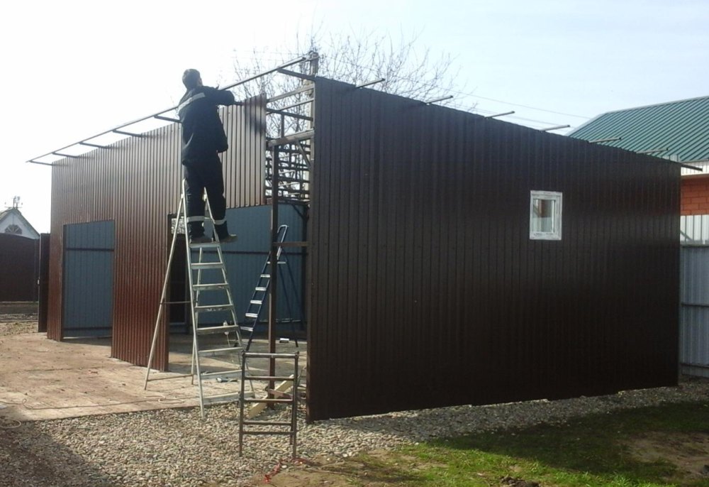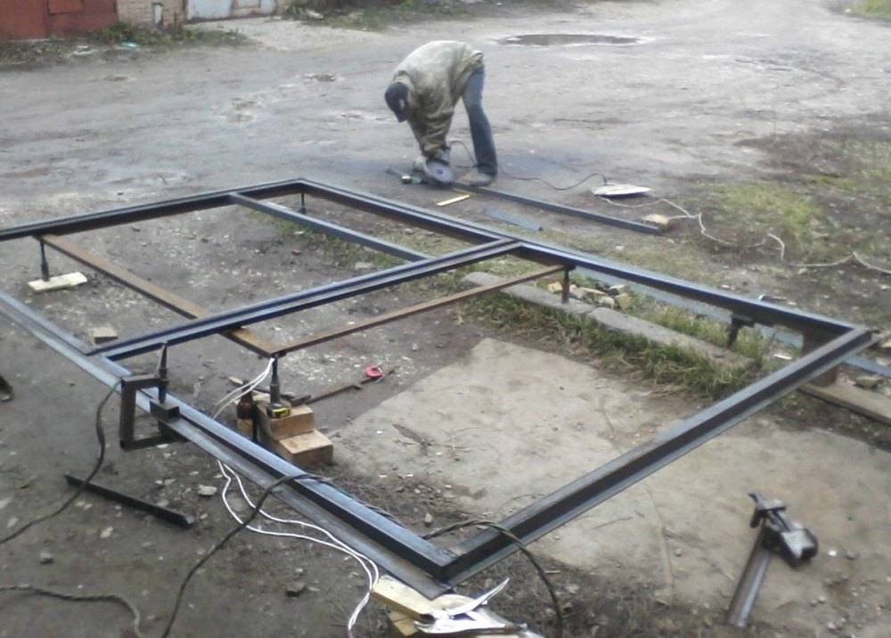 После сборки каркаса приступают к установке гаражных ворот. Для этого используют профиль из металла с сечением 60х60 мм. Из него изготавливают детали по размерам будущих ворот, соединяют сваркой или металлическими уголками. Затем навешивают на них петли, обшивают профлистом и устанавливают конструкцию на место.