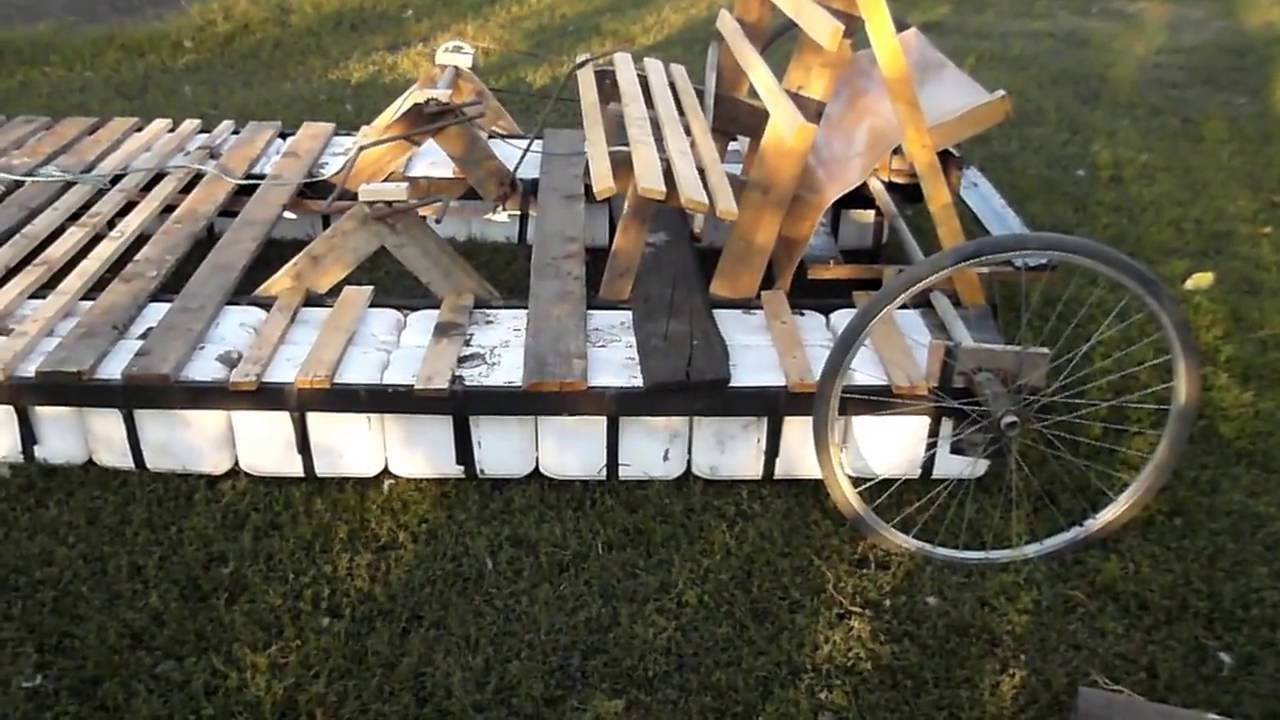 Морской водный катамаран делается своими руками по такому же принципу, что и для малых водоемов. У морского судна палуба должна быть более прочной. Для повышения прочности шпангоуты (рейки) следует фиксировать на расстоянии 32 см друг от друга. Плоскость самой палубы делается из двойного слоя фанеры. Гребные колеса изготавливаются из велосипедных колес. Лопасти делаются из резины (толщина до 8 мм). Каждое колесо имеет не меньше 6 лопастей. Руль изготавливается из алюминиевого листа, размер его 220х340 мм