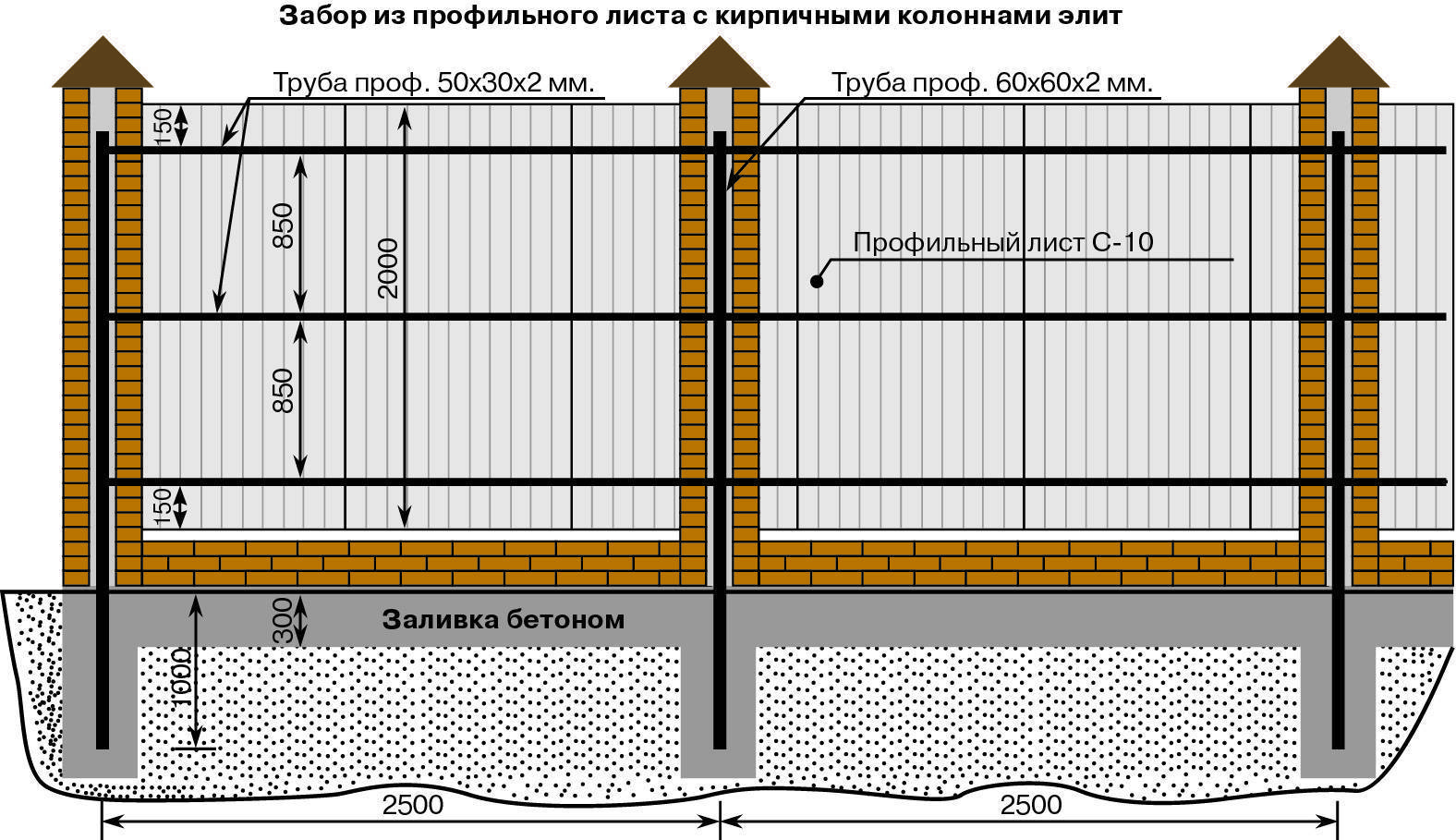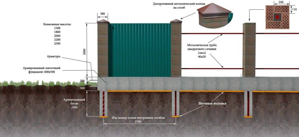 В большинстве случаев столбы для забора делают в 1,5 или 2 кирпича, сечение 380*380 мм и 510*510 мм соответственно, высота — до 3-х метров.