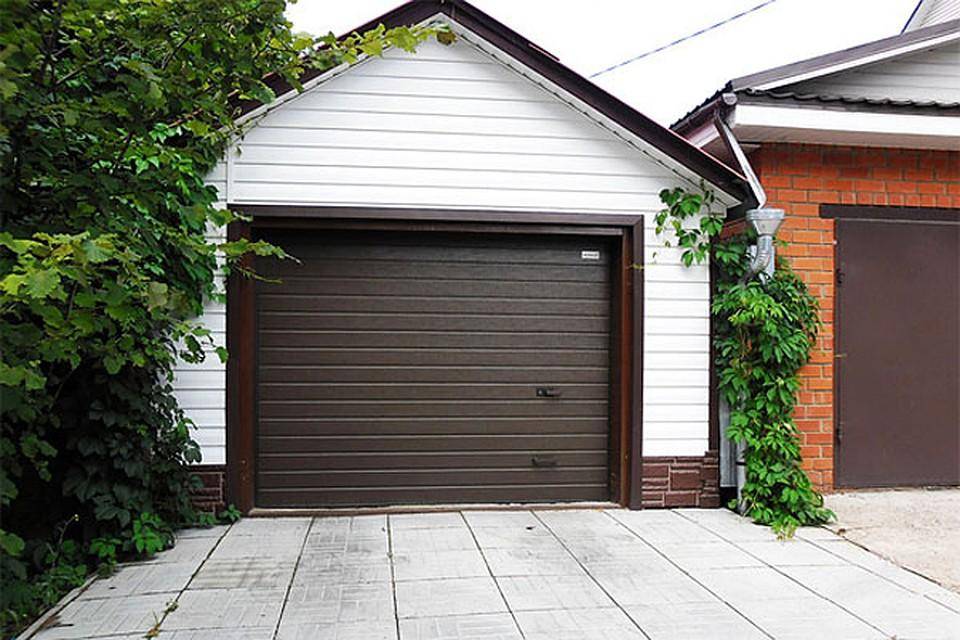 Секционно-подъемные ворота ставят в гаражах, хозблоках, других технических помещениях. Они удобны тем, что при открывании просто поднимаются вверх, не требуя свободного пространства перед полотном. Еще один плюс — есть утепленные модели, которые имеют такие же теплоизоляционные характеристики как кирпичная стена в полтора кирпича