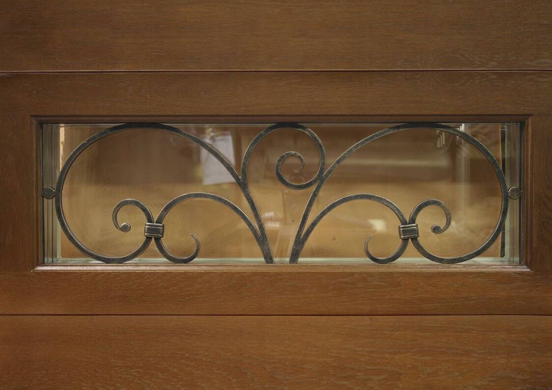 Именно поэтому комбинированные модели приходятся как нельзя лучше. Дверь со стеклом и ковкой часто дополняют элементами из третьего материала. Например, клиенты имеют возможность увидеть в перечне продукции производителей деревянные сооружения со стеклянным окошком, декорированным кованым орнаментом.
