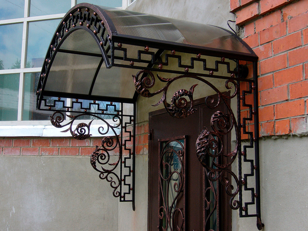 Кованый козырек с пластиком и дверь с окошком. Фото ТехИнКов