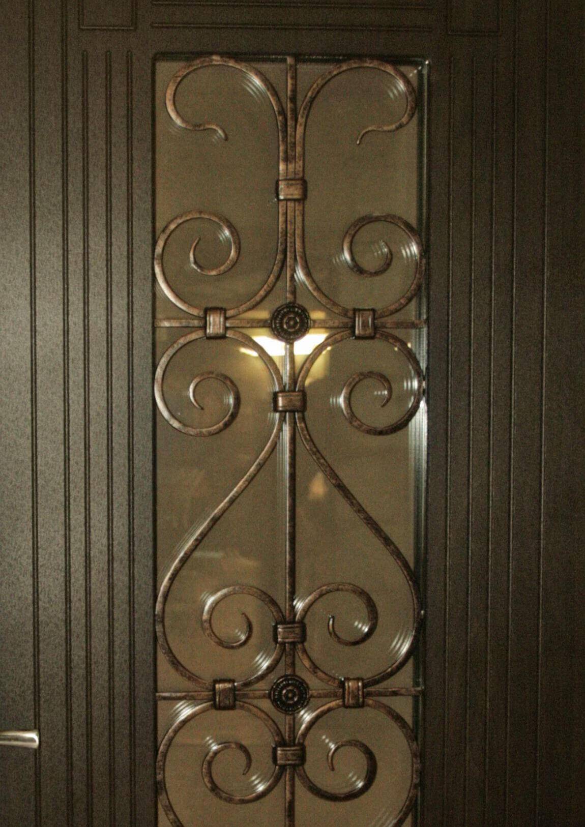 Металлическую входную дверь со стеклом целесообразно дополнить коваными элементами: