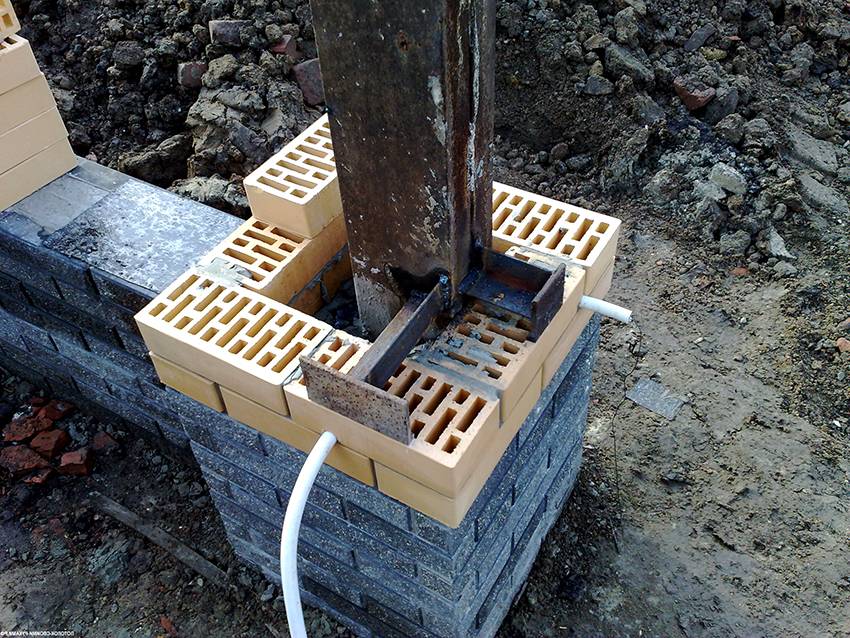 - Стойки приваривают к закладным деталям, которые устанавливаются в процессе кладки стены. В качестве закладных часто используют арматуру диаметром 12-16 мм, длиною по 50 см. Шаг укладки – через каждые 6-8 рядов.