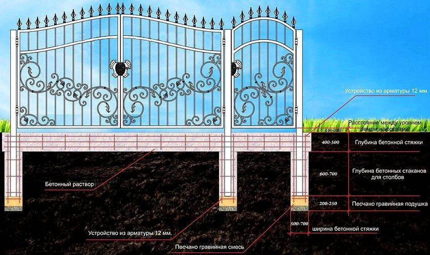 Так как кованые ворота имеют большую массу, опоры под них должны быть прочными и надежными. Самым лучшим вариантом в этом случае является организация прочных столбов с кирпичной кладкой. Каждая опора должна иметь основание, представленное стержнем, обеспечивающим необходимую устойчивость.
