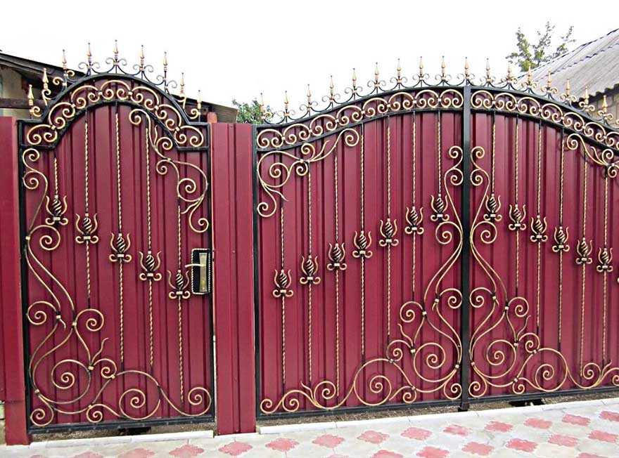 Материал часто используется в качестве фона оформления конструкции воротных створок коваными элементами. Кованые ворота из профлиста отлично сочетаются с аналогичным забором.