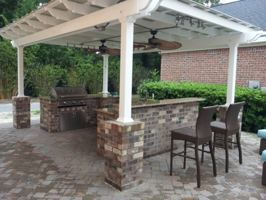 Постройка включает в себя столбы для вертикальной опоры и непосредственно саму кровлю. Для выполнения каркасы используется древесина, металлические балки, бетон, кирпич, камень.
