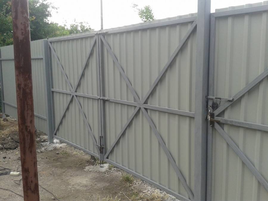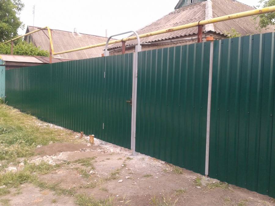 Глухие заборы для частного дома делают из стенового профлиста. Достоинства ограждения — большая цветовая гамма, многослойное защитно-декоративное покрытие, защищенность участка от проникновения, ветра и пыли со стороны дороги. Недостаток — высокие ветровые нагрузки (присущие для всех видов глухих пролетов).