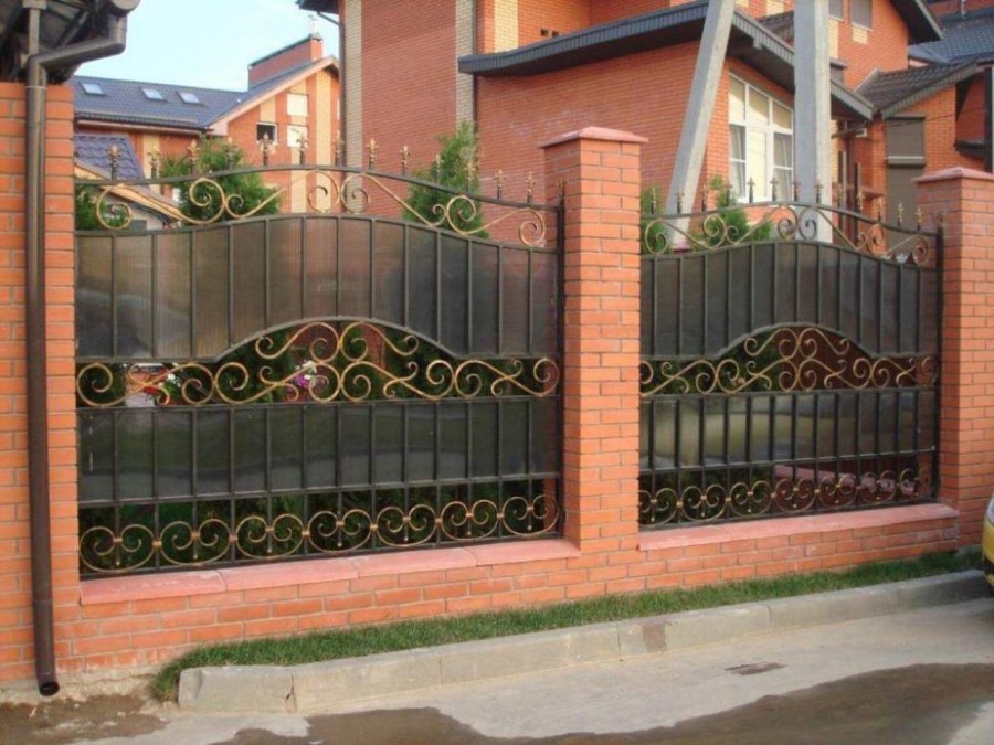 Обычно из кирпича сооружают столбы, фундамент и другие несущие конструкции. Профилированные листы, штакетник, металлические сварные или кованые конструкции используют для изготовления секций.