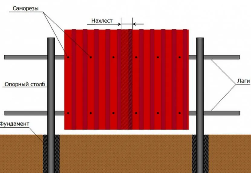 Листы должны накладываться внахлёст, такое расположение позволяет укрепить забор. Для укрепленных связей профлиста и других элементов, нужно вкручивать саморезы в волну листа. Такое расположение обеспечивает плотное прилегания элементов забора.