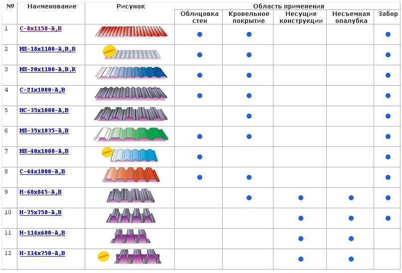 Предлагаем таблицу общей и рабочей ширины профилированного листа по маркам. Только сразу отметим, что у разных производителей ширина на несколько миллиметров может и отличаться: