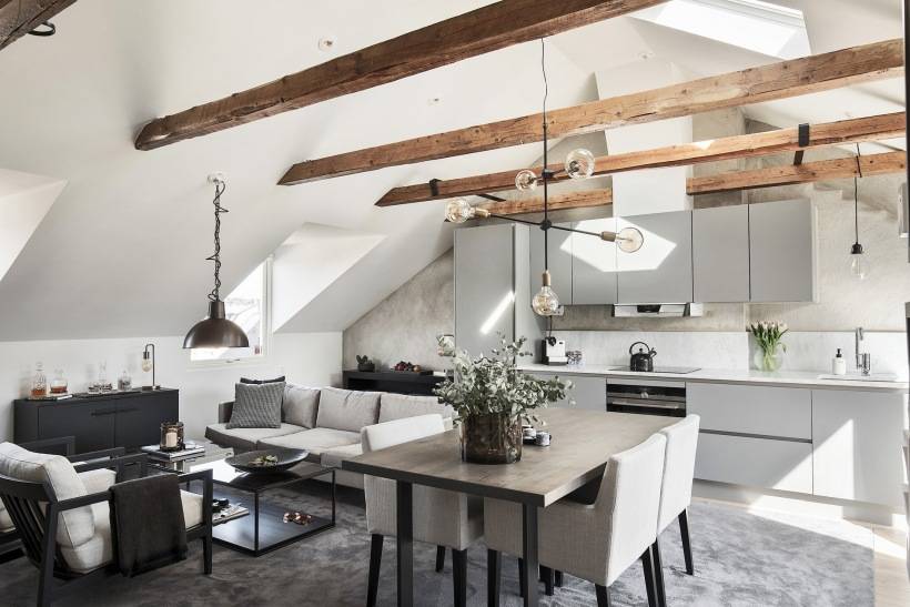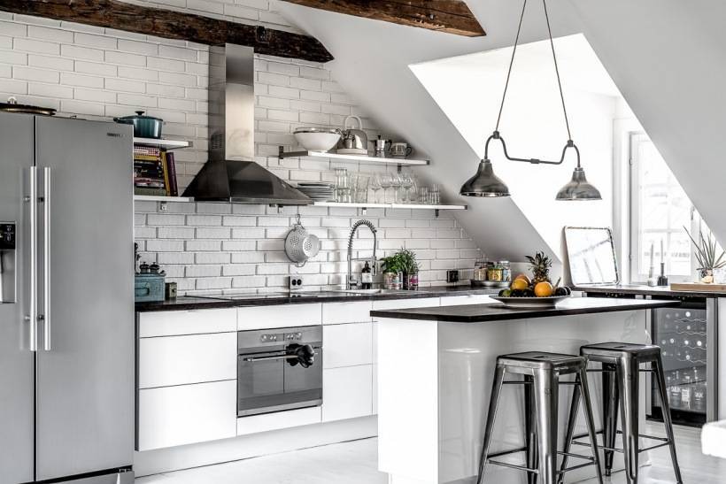 На чердак можно поместить холодильник, посудомоечную машину, духовку, а также плиту и стол со стульями, также вам не нужно ограничивать себя в отношении каких-либо столешниц и другой кухонной техники. Нет сомнений, что кухня с гостиной на чердаке, безусловно, удачный вариант. Такое расположение комнат придает интерьеру стиль, шарм, легкость и современную атмосферу.