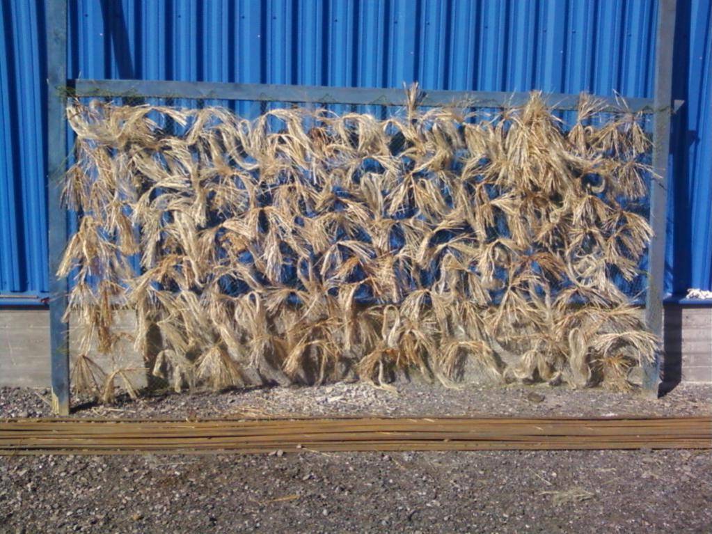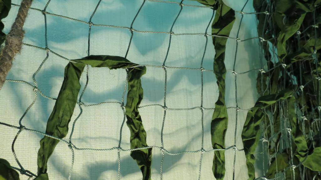 Вешаем сетку и — так как полосы нам делать не нужно — начинаем плести природные элементы, хранящиеся в ячейках, в хаотичном порядке (креатив может быть любой, главное не перегружать сетку). При этом асимметрия должна быть максимальной, иначе маскировочная сетка потеряет свой естественный вид — иными словами, не должно быть скопления одного вида материала с одной стороны и с другой.
