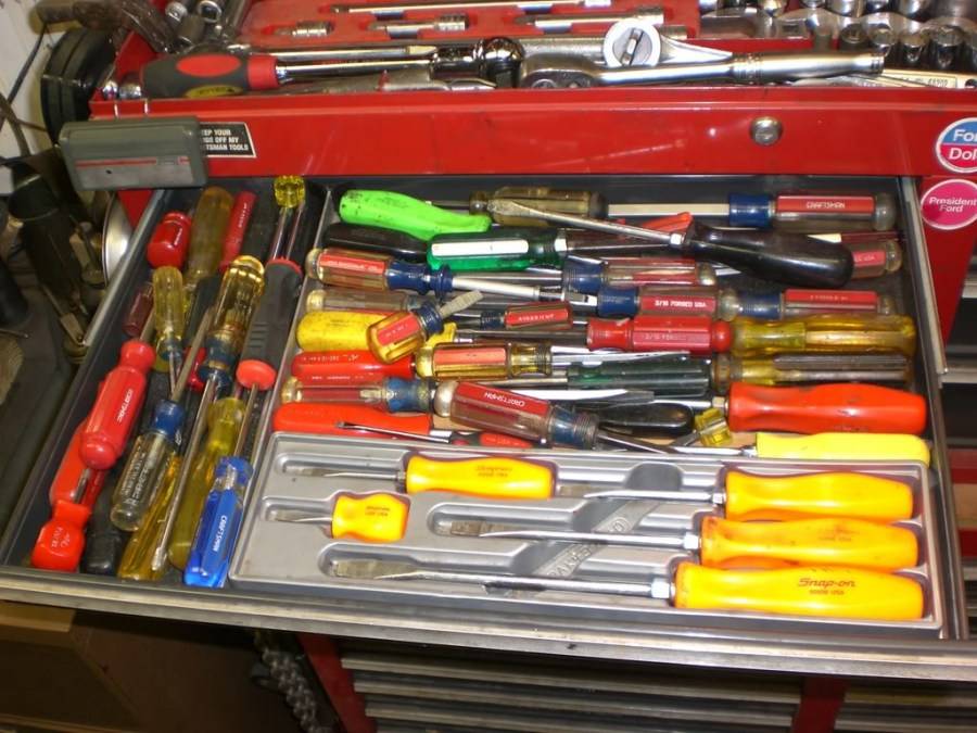 Наличие экрана и кронштейнов позволяет подвесить некоторые инструменты прямо над столом – для некоторых видов работ такой подход считается наилучшим вариантом. Внешний вид верстака может быть разным: всё зависит от желания и количества инструмента, который нужно аккуратно и удобно расположить возле рабочей поверхности. Одна или две тумбы верстака могут вмещать в себе большие и малые инструменты – внутри каждого ящика лучше всего размещать что-то определённое, не смешивая разные типы инвентаря для простоты его поиска.