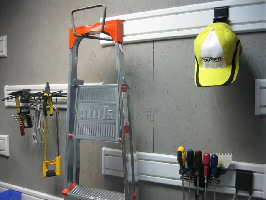 В магазинах можно найти так называемые гладиаторы, подходящие для хранения предметов различных размеров. Вместо обычных крючков, для фиксации крупногабаритных инструментов рекомендуется приобрести PowerTrack. Эта продукция выносит воздействие агрессивных сред и выдерживает грузы весом до 30 килограмм.