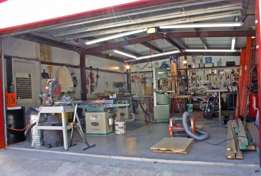 После окончания всех работ устанавливают верстак, полки и стеллажи, заносят мебель, вешают лампы.