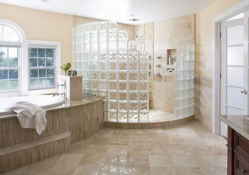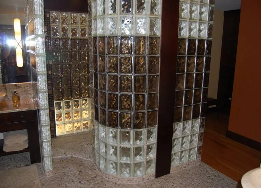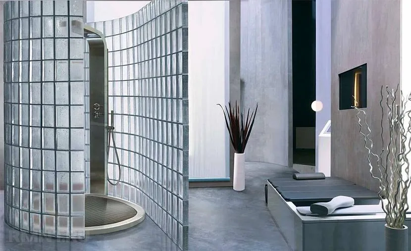 Относительно новым строительным материалом для возведения перегородок считаются стеклянные блоки. Они отличаются простотой и легкостью сборки, а также выглядят довольно современно и стильно. В зависимости от производителя стеклоблоков, их толщина может составлять от 6 до 10 мм. Разнообразие дизайнов радует глаз. Поверхность стекла может быть идеально гладкой, рифленой, прозрачной, матовой или цветной. Помимо всего прочего на стеклянную поверхность можно наносить различные изображения, вплоть до фотографий.