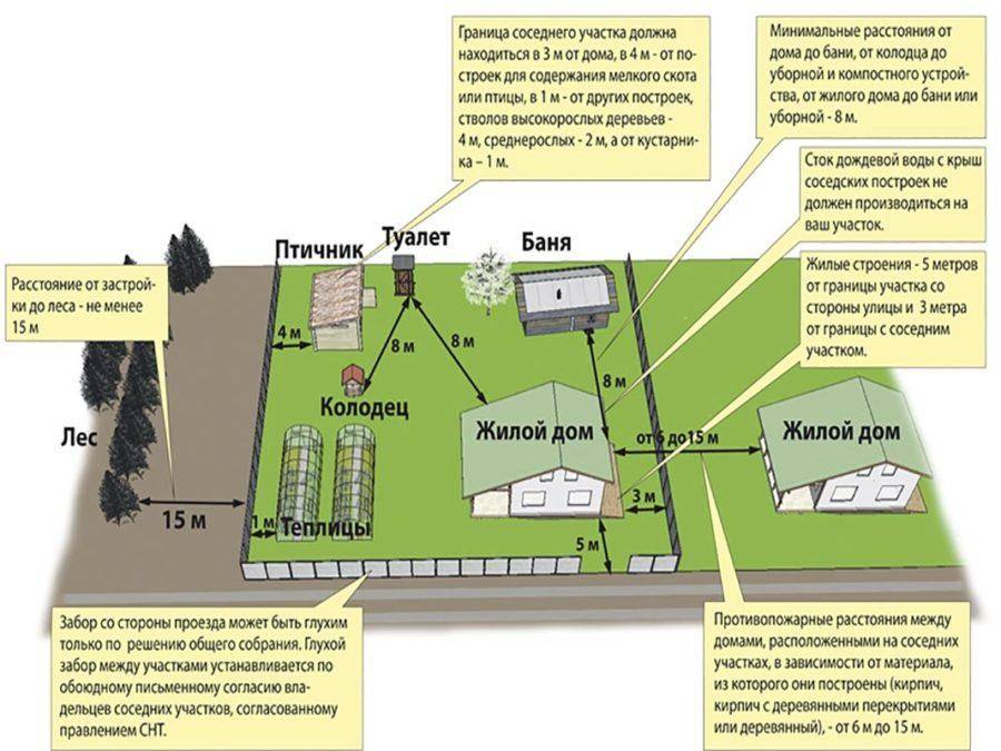 Вопрос о планировании расположения построек на участках СНТ и ИЖС регулируется рядом санитарных и пожарных правил. Более того, ситуация может дополнительно ужесточатся при наличии местных нормативных актов районной администрации или локальных актов садового кооператива.