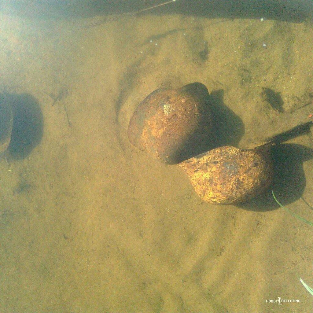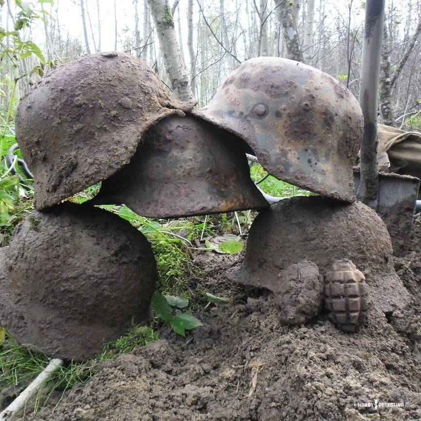 Как писал выше — в водоёмы скидывали не только оружие или ВОПы, но и каски. Не ленитесь смотреть под воду.