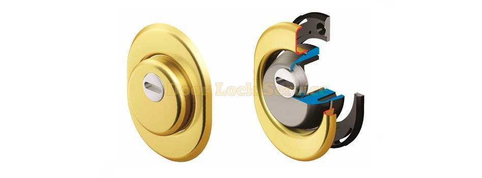 Поворотная магнитная антивандальная защита DiSec на сувальдные скважины поставляется в трех цветовых решениях — PVD (золото), матовый никель и бронза. В качестве обрамляющей декорации используются овальные накладки, соответствующих цветов.