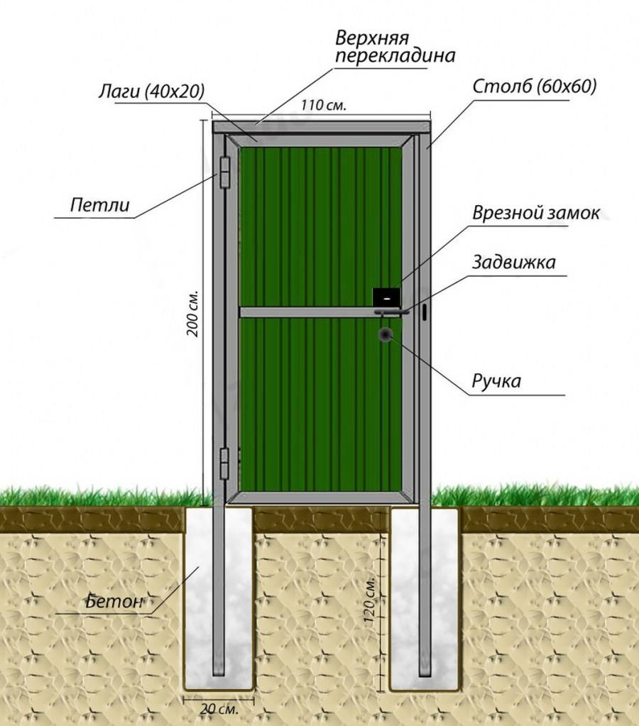 Размер должен быть максимально удобным как для проходящего человека, так и для людей, заносящих, например, предметы мебели или стройматериалы. Именно поэтому рекомендуют проектировать ширину конструкции не менее 750-1000 мм. Столбы учитывать не надо. А вот по высоте дверь должна быть ориентировочно 1,8-2 м.