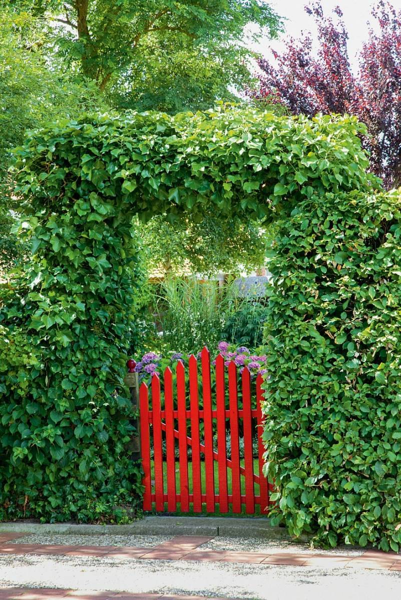 Если пустить по створкам отростки стелющегося плюща или, например, девичьего винограда, вид получится красивым, но ворота не будут открываться. Поэтому в качестве альтернативы выберите небольшие подвесные кашпо с петуниями или другими цветами.