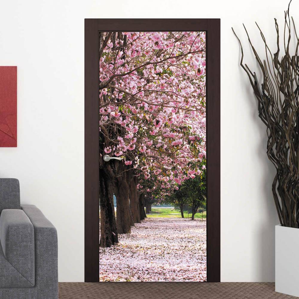 Виниловые полотна подобранного дизайна, прекрасно справятся с задачей преображения проема, ведущего в разные помещения. Главное, чтобы они четко соответствовали размерам вашей двери, иначе придется разрезать готовое изделие, нарушая гармоничность и картинку изделия.
