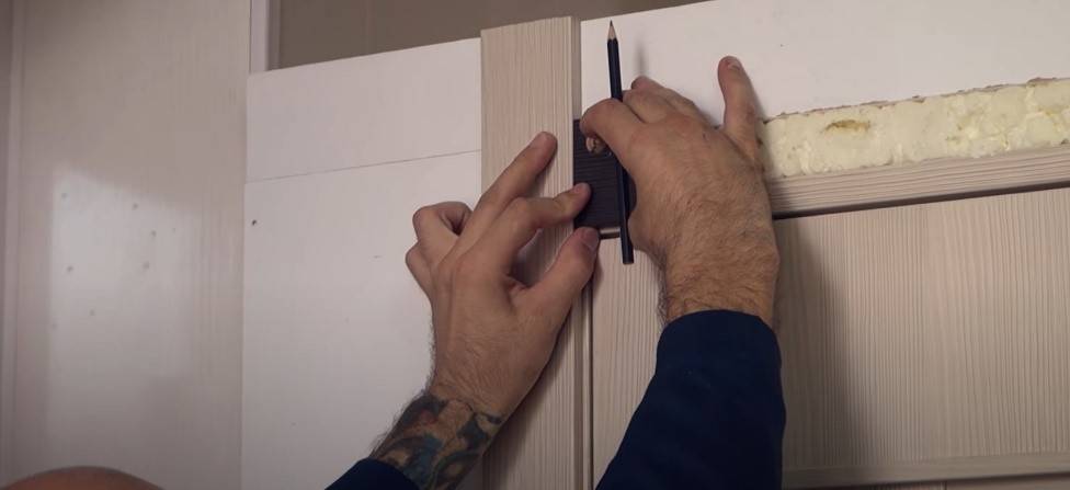 - Мастер откладывает на планке показания, полученные при замере проёма, нанося риски на поверхности детали карандашом.