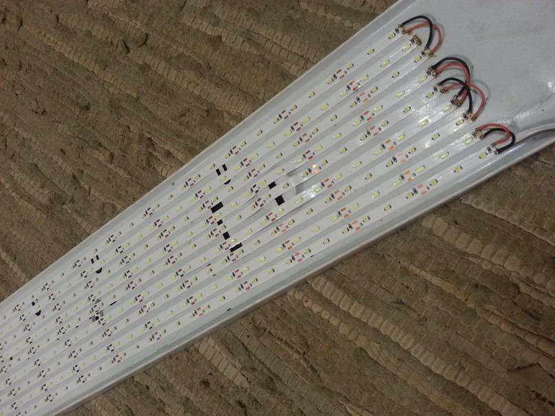 Далее изготавливаем из алюминия светоотражатель. В него монтируем светодиодные светильники. Для этого используем клей, которым по очереди фиксируем каждый световой диод. Отражатель лучше всего зафиксировать к какому-либо держателю.
