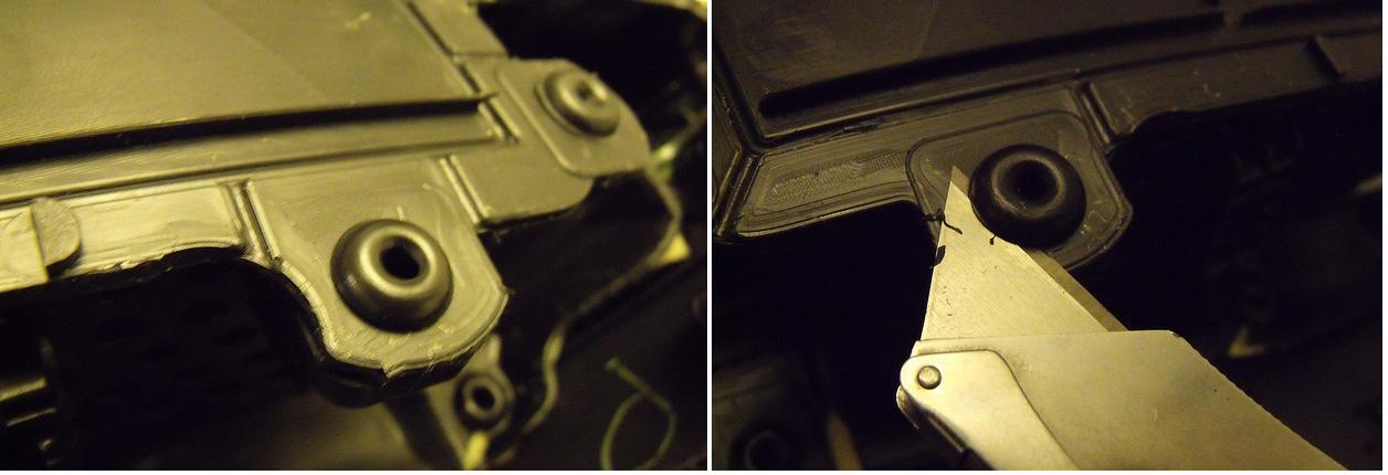 Вставку можно прикрепить при помощи расплавленных пластмассовых стержней, образующих «грибок». Этот грибок можно сточить при помощи инструмента (dremmel) или дрели со специальной шлифовальной насадкой. Можно также использовать нож со сменными лезвиями.