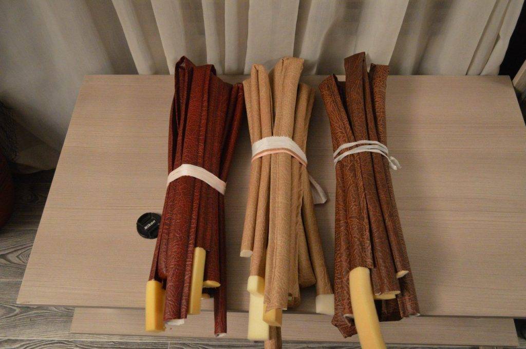 Чтобы обивка дверей дермантином смотрелась эстетично, необходимо изготовить валики, фото которых ниже. Для этого понадобятся полоски дермантина шириной от 100 до 150 мм. Приобретать дополнительно их необязательно, можно использовать обрезки, которые остались после раскроя основного материала. Что касается длины валиков, то она должна быть немного больше, чтобы по углам полотна сформировать красивые напуски.
