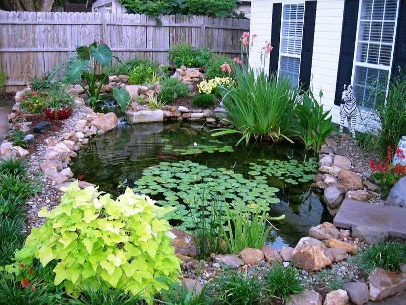 При дефиците площади создается миниатюрный водоем из пластиковой емкости. Ванна, большой таз или другой подходящий сосуд вкапывается в почву, обкладывается галькой и наполняется водой. Картинку дополнят садовые фигурки лягушат, уток и прочей живности, обитающей возле воды.