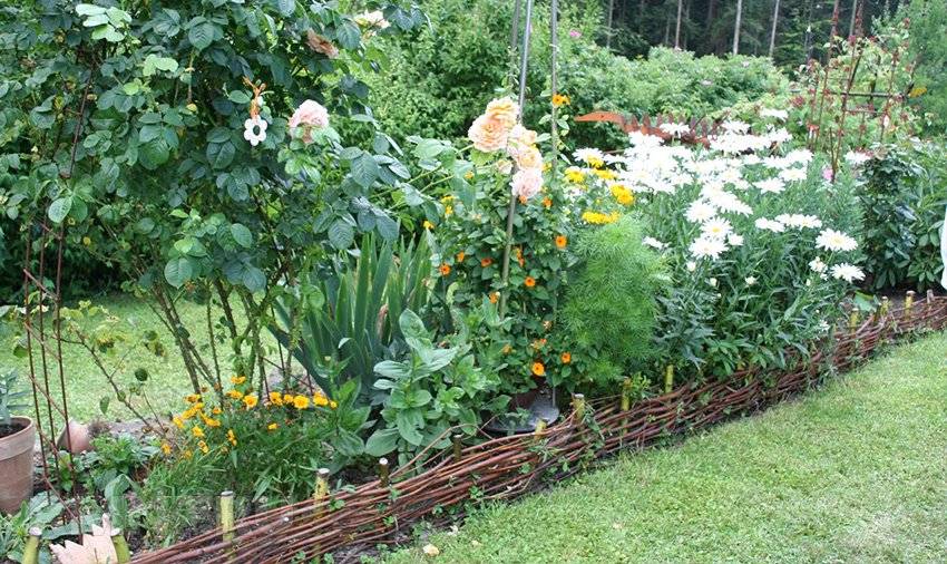К сведению!Разделить газон и цветник, обозначив их контуры, можно низким заборчиком высотой 5-7 см.