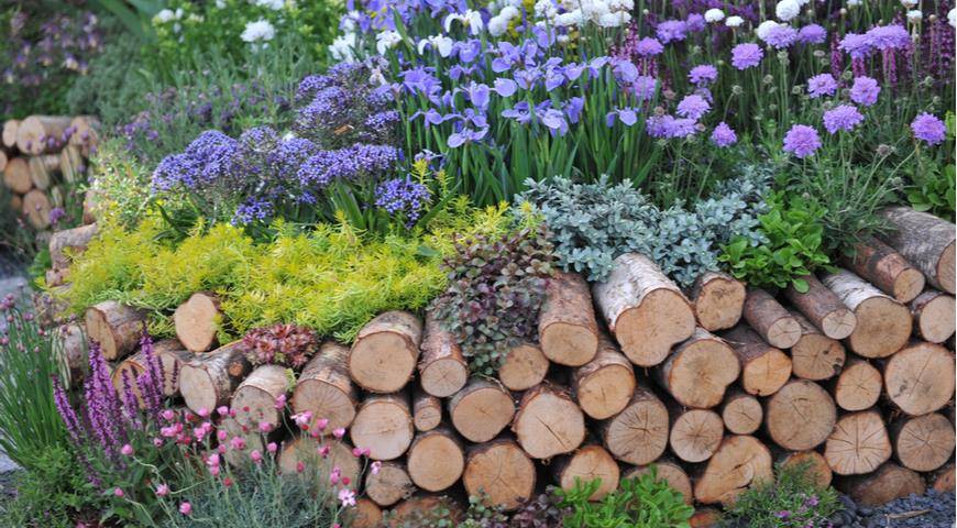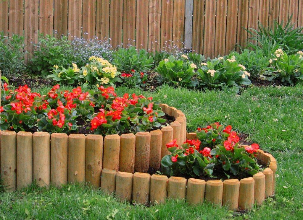 Кроме того, низ бревнышек можно завернуть в рубероид – это надежно защитит древесину от грунтовой влаги. По периметру планируемой клумбы глубиной 20 см выкапывают канавку, в неё плотно и ровно устанавливают бревнышки и, хорошо утрамбовывая, засыпают грунтом. Если дерево хорошо защищено от влаги, такая оградка простоит, как минимум, лет десять.
