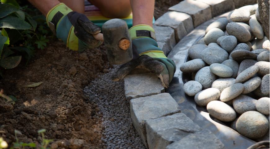 Если вам нужен только невысокий бордюр, то камни покрупнее вдавите в бетонную подушку, а маленькими камешками — закройте щели с помощью раствора.