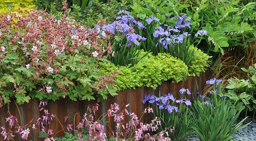 Миксбордер в угловой части ограждения способен украсить двор, и даже сад. Высокорослые культуры в композиции всегда отправляют на задний план. Спереди высаживают почвопокровные или низкорослые цветы.