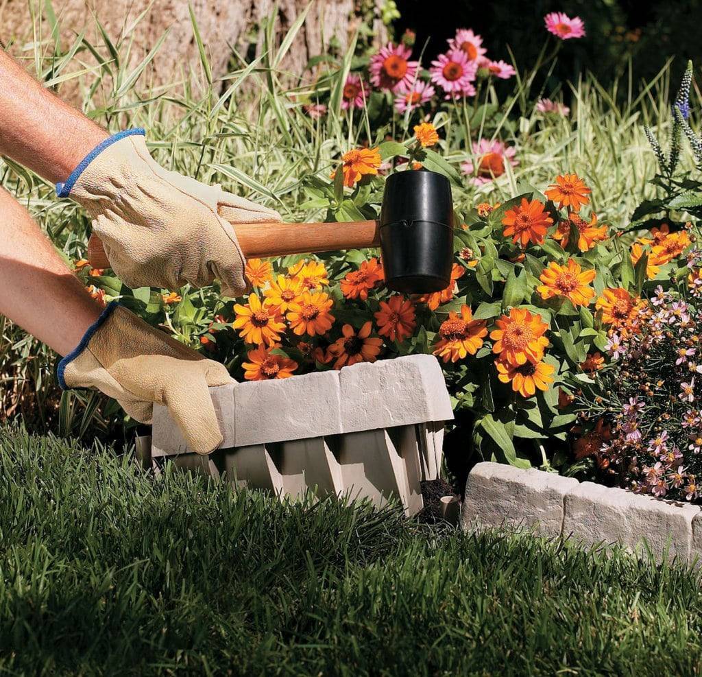 При устройстве бордюра на ровной территории элемент помогает зонировать участок, для разграничения подойдут невысокие конструкции с небольшой массой (пластик, ветви). Для блокировки роста корневой системы используют материалы из синтетических компонентов.