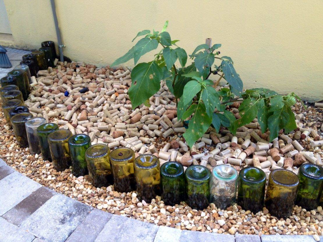 Популярным вариантом является обрамление из бутылок: пластиковых или стеклянных. Траншею нужно выкопать глубиной в половину бутылки, тары помыть, вставить горлышком вниз, полить водой и утрамбовать грунт. Так проделать для каждой бутылки.