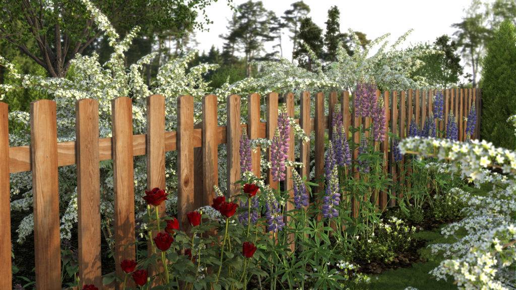 Ограда для палисадника из дерева являет собой классический вариант. И как природный материал легко вписывается в любой ландшафтный дизайн двора. Но есть свои недостатки. Необходимость постоянного ухода, покраски, пропитки противогрибковыми средствами, недолговечность.