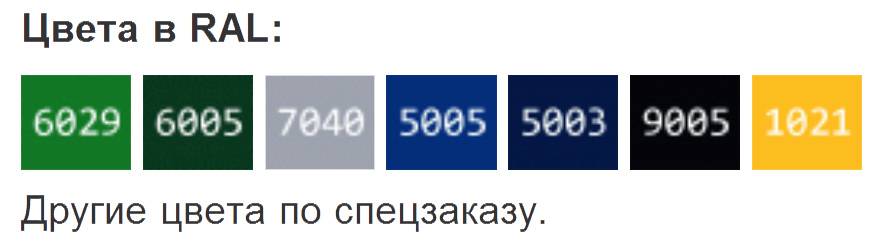 Цветовая палитра зависит от пожеланий потребителя. В продажу поступают изгороди из металла самого разного оттенка — чаще зелёного, реже — синего, голубого и др.