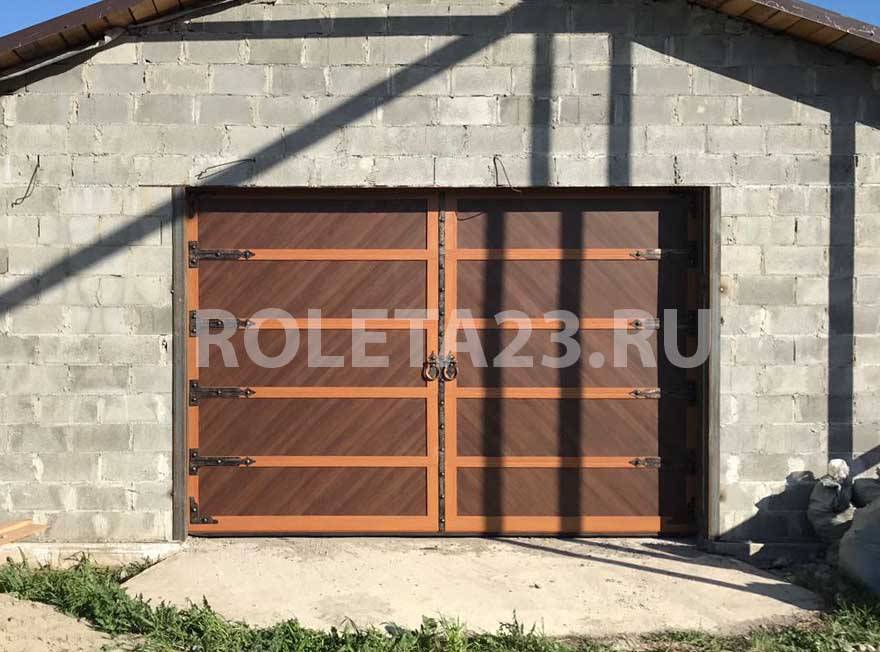 Этот вид остается самым распространенным, невзирая на появление иных способов автоматического закрытия въезда в гараж. Чаще он выполняется на две створки. Поскольку некоторые типы грунта зимой подвержены пучению, иногда приходится поднимать гаражные ворота выше уровня земли, чтобы предотвратить затруднения с открытием. Для створок требуется много свободного места перед гаражом, поэтому с целью комфортного использования встраивают небольшую калитку.