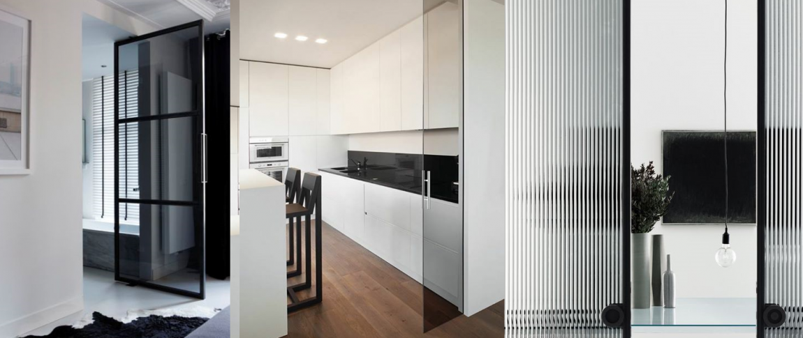 Приветствуется использование стеклянных вставок в полотнах, это подчеркивает визуальное расширение пространства.