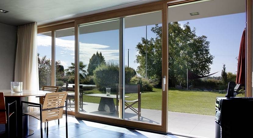 Также в доме устанавливают дверь-панорамное окно. По сути это те же раздвижные и складные конструкции, которые используются и для остекления террас.
