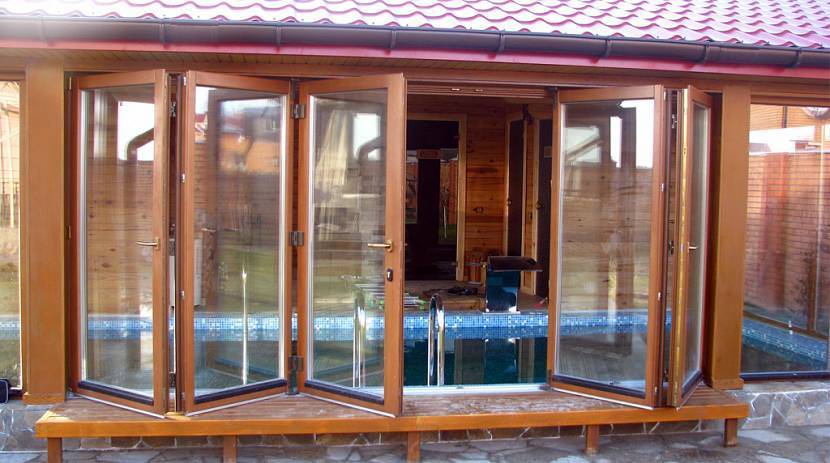 Складные-сдвижные. В отличие от предыдущих видов система достаточно необычная в исполнении и состоит из нескольких створок. По способу открывания данная модель напоминает гармошку, выглядит достаточно стильно и функционально. Если необходимо, можно полностью открыть проем или же закрыть его, защищая веранду от ветра, пыли или дождя. Если было принято решение установить такой тип конструкции, тогда стоит помнить, что она обладает низкими теплоизоляционными качествами и устанавливается либо как межкомнатная, либо же как дверь на теплое время.
